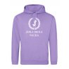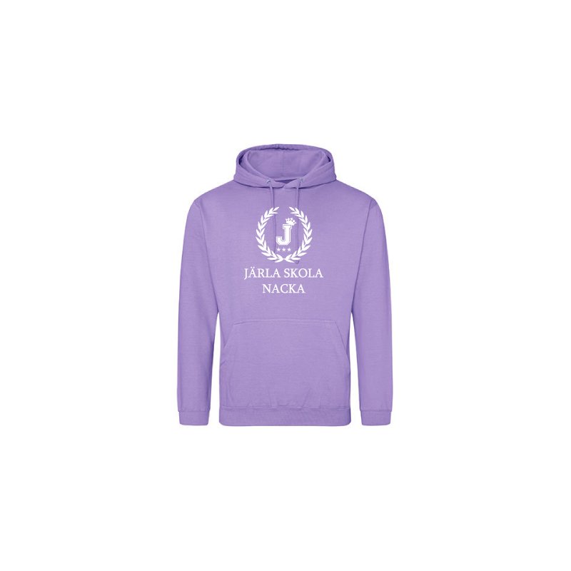 Skön skoltröja med dubbel luva och ficka på magen, fleecad insida och ganska rymliga storlekar. Stort svart tryck över bröstet, ev. namntryck på höger axel.